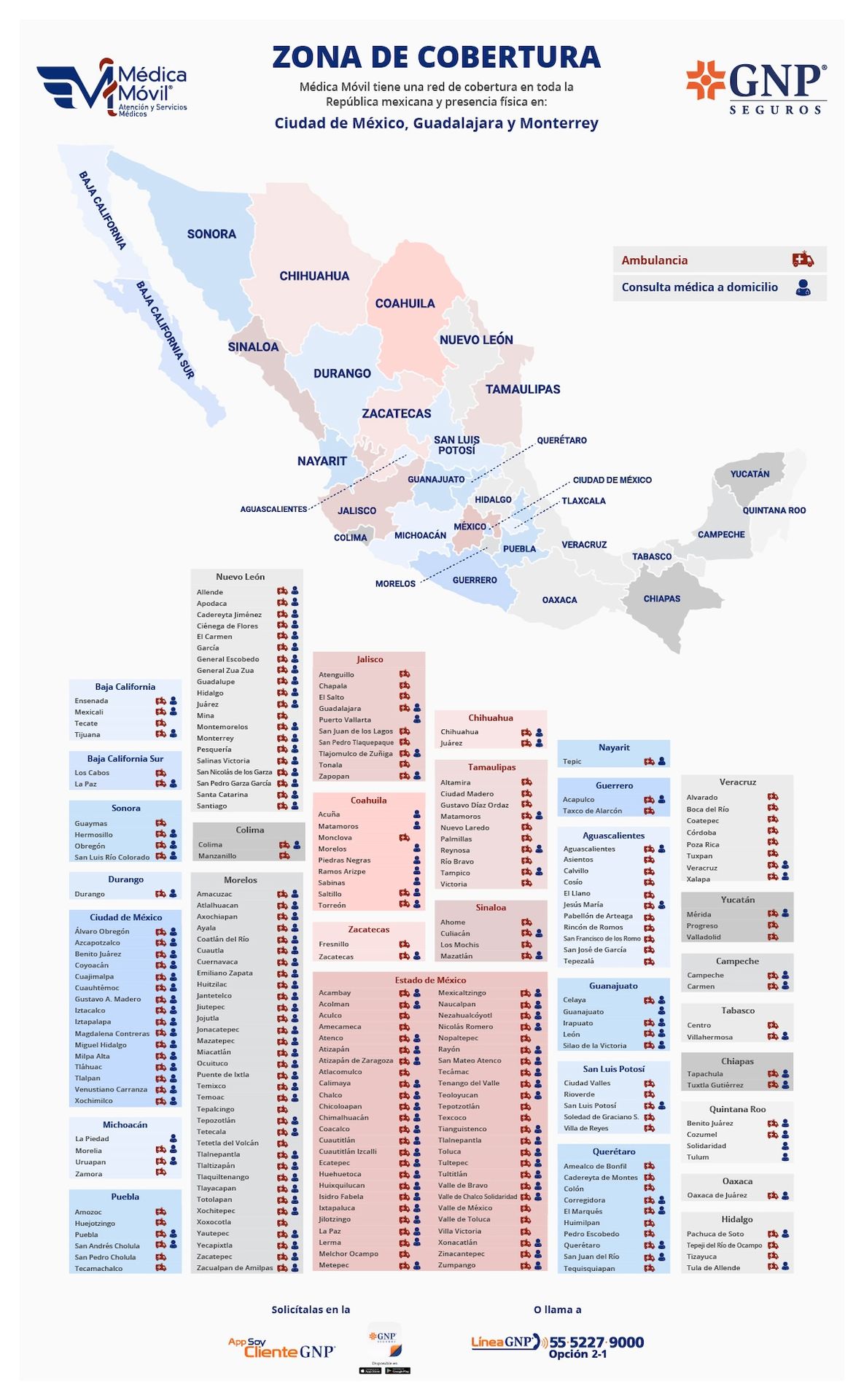 Médica Móvil tiene una cobertura en toda la República Mexicana y presencia física en: